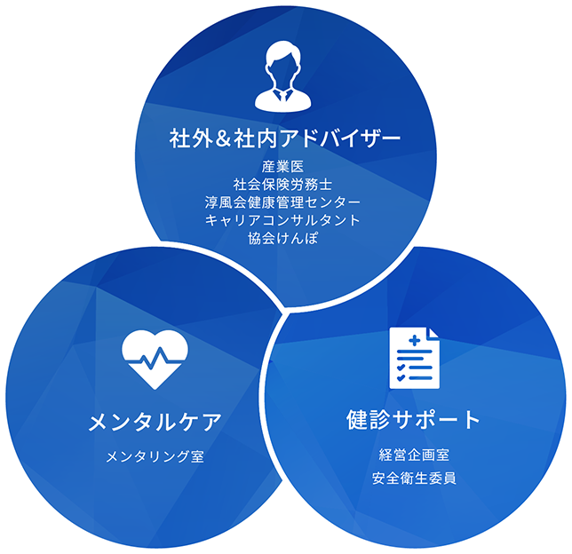 社員の⼼と体の健康は、私たちの使命である「未来の技術への挑戦」に必要で重要な「⼟台」です。